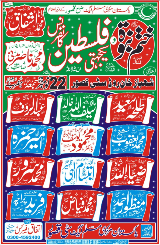 تفصیلات کے مطابق آج مورخہ 22 نومبر 2024 بروز جمعتہ المبارک بعد نماز مغرب سٹی قصور میں شہباز خان روڈ میں پاکستان مرکزی مسلم لیگ کی جانب سے ختم نبوت و یکجہتی فلسطین کانفرنس کا انعقاد کیا گیا ہے جس میں ملک بھر سے سیاسی و مذہبی جماعتوں کے قائدین خطاب فرمائیں گے نیز ملک بھر سے لوگ اس کانفرنس میں شرکت کرینگے