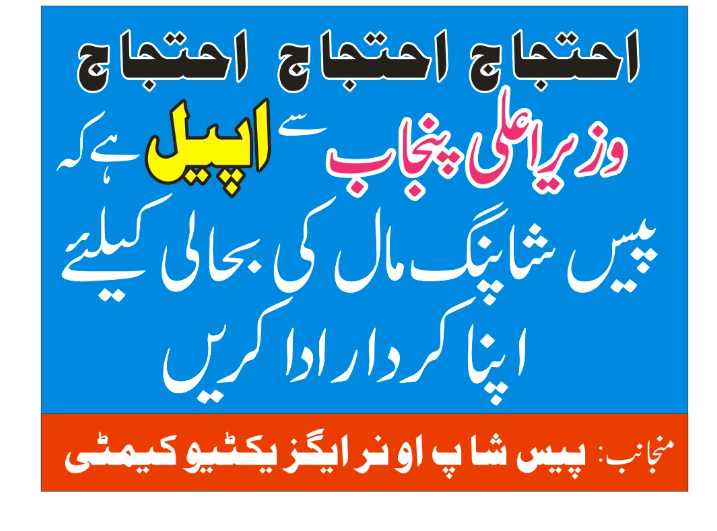 پیس شاپنگ مال اونر ایگزیکٹو کمیٹی کے اراکین نے احتجاج کے دوران بینرز اور کتبے اٹھا رکھے تھے، مظاہرین اپنے مطالبات کے حق میں نعرے بازی بھی کر رہے تھے،مظاہرین نے پیش منیجمنٹ مردہ باد، ساڈہ حق ،ایتھے رکھ، نعرے لگائے،مظاہرین نے جو کتبے اٹھا رکھے تھے ان پر خودکشی کو تیار، معاشی بدحالی کا شکار،پیس منیجمنٹ زمہ دار،جیسی تحریریں درج تھیں