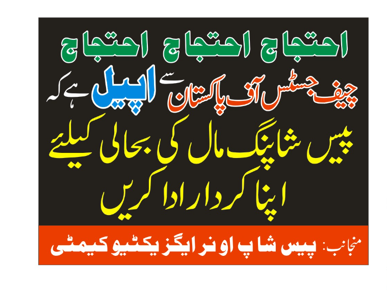 پیس شاپنگ مال اونر ایگزیکٹو کمیٹی کے اراکین کا کہنا تھا کہ چیف جسٹس پیش شاپنگ مال کی بحالی کے لئے کردار ادا کریں،16 سو خاندانوں کی بے روزگاری کی زمہ دار پیس منیجمنٹ ہے،ہمارا روزگار بحال کیا جائے،دکاندار بھوکے مر رہے ہیں، ہمیں دوکانیں دی جائیں تا کہ ہم کام شروع کر سکیں، ہمارا سرمایہ ضائع ہو گیا، مہنگائی کے اس دور میں ہم کس کا در کھٹکھٹائیں،چیف جسٹس ہمارے کاروبار کی بحالی کے لئے کردار ادا کریں، نگران وزیراعلیٰ پنجاب محسن نقوی بھی کردار ادا کریں