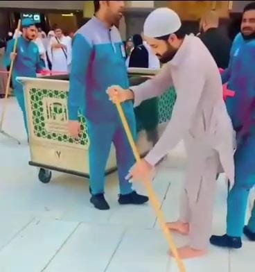 قومی کر کٹر محمد رضوان مسجد الحرام کی صفائی کرتے ہوئے
