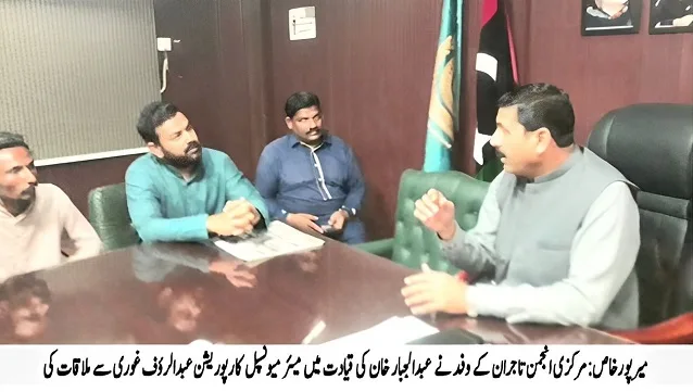 انخیالات کا اظہار مرکزی انجمن تاجران و شہری حقوق کمیٹی کے مرکزی نگران عبدالجبارخان نے میرپورخاص کارپوریشن کے میئرعبدالرٶف غوری سے ان کے دفتر میں خصوصی ملاقات کے دوران کیا عبدالجبارخان نے کہا کہ ہمیں فخر ہے کہ مرکزی انجمن تاجران کے نائب صدر و میئر میرپورخاص کارپوریشن عبدالرٶف غوری نے شہری حقوق کمیٹی اور عوام سے کیے وعدے دن رات انتھک جدوجہد کرنے کے بعد وفا کئے اور مسلسل کارپوریشن کے لئے اپنی خدمات سرانجام دے رہے ہیں ہم انہیں خراج تحسین و سلام پیش کرتے ہیں اور امید کرتے ہیں کے یہ اسی طرح عوامی مسائل کے لیے اپنے فرائض کو سرانجام دیتے رہیں گے
