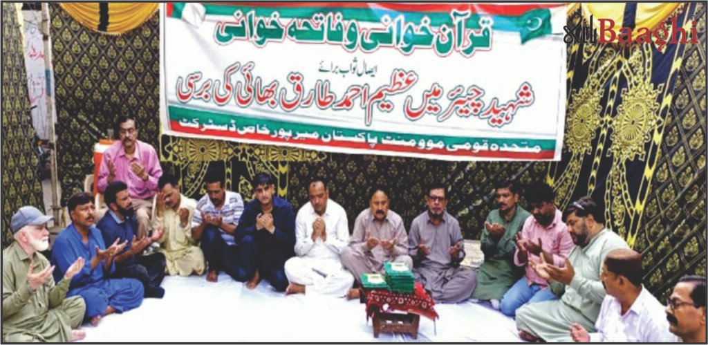 میرپورخاص میں ایم کیو ایم پاکستان ڈسٹرکٹ کے زیراہتمام شہید بانی چیئرمین عظیم احمد طارق کی 32ویں برسی کے موقع پر متحدہ ضلعی دفتر میں قرآن خوانی و فاتحہ خوانی کی تقریب منعقد ہوئی۔ تقریب میں انچارج سندھ تنظیمی کمیٹی سلیم رزاق، رکن ایس ٹی سی شفیق احمد، ڈسٹرکٹ انچارج خالد تبسم، ڈسٹرکٹ جوائنٹ انچارجز آفاق احمد خان، سلیم میمن، اراکین ڈسٹرکٹ کمیٹی، تمام یوسیز کے ذمہ داران و کارکنان، اے پی ایم ایس او، یو ایل ایف، ایلڈرز ونگ سمیت دیگر شعبہ جات کے ذمہ داران و کارکنان نے بڑی تعداد میں شرکت کی۔