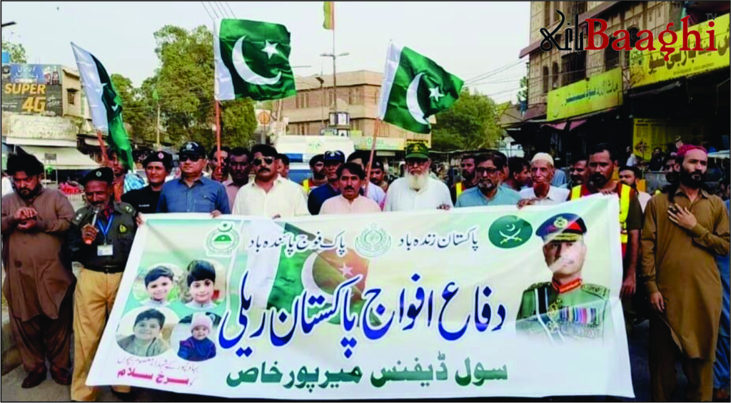 میرپورخاص (باغی ٹی وی، نامہ نگار سید شاہزیب شاہ) محکمہ شہری دفاع، ریسکیو 1122 اور سول سوسائٹی کی جانب سے پاک فوج سے اظہار یکجہتی کے لیے اسٹیشن چوک سے مارکیٹ چوک تک ریلی نکالی گئی، جس کی قیادت ڈپٹی کنٹرولر سول ڈیفنس فہیم میمن نے کی۔