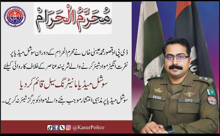 تفصیلات کے مطابق امن و امان کو یقینی بنانے کیلئے اور فرقہ واریت کو روکنے کیلئے ڈی پی او قصور محمد عیسیٰ خاں نے محرم الحرام کے دوران سوشل میڈیا پر نفرت انگیز مواد شیئر کرنے والے شرپسند عناصر کے خلاف کاروائی کیلئے سوشل میڈیا مانیٹرنگ سیل قائم کر دیا ہے جو فرقہ واریت پھیلانے اور نفرت انگیز مواد شئیر کرنے والوں کو پکڑ کر قانون کے کٹہرے میں لائے گا
