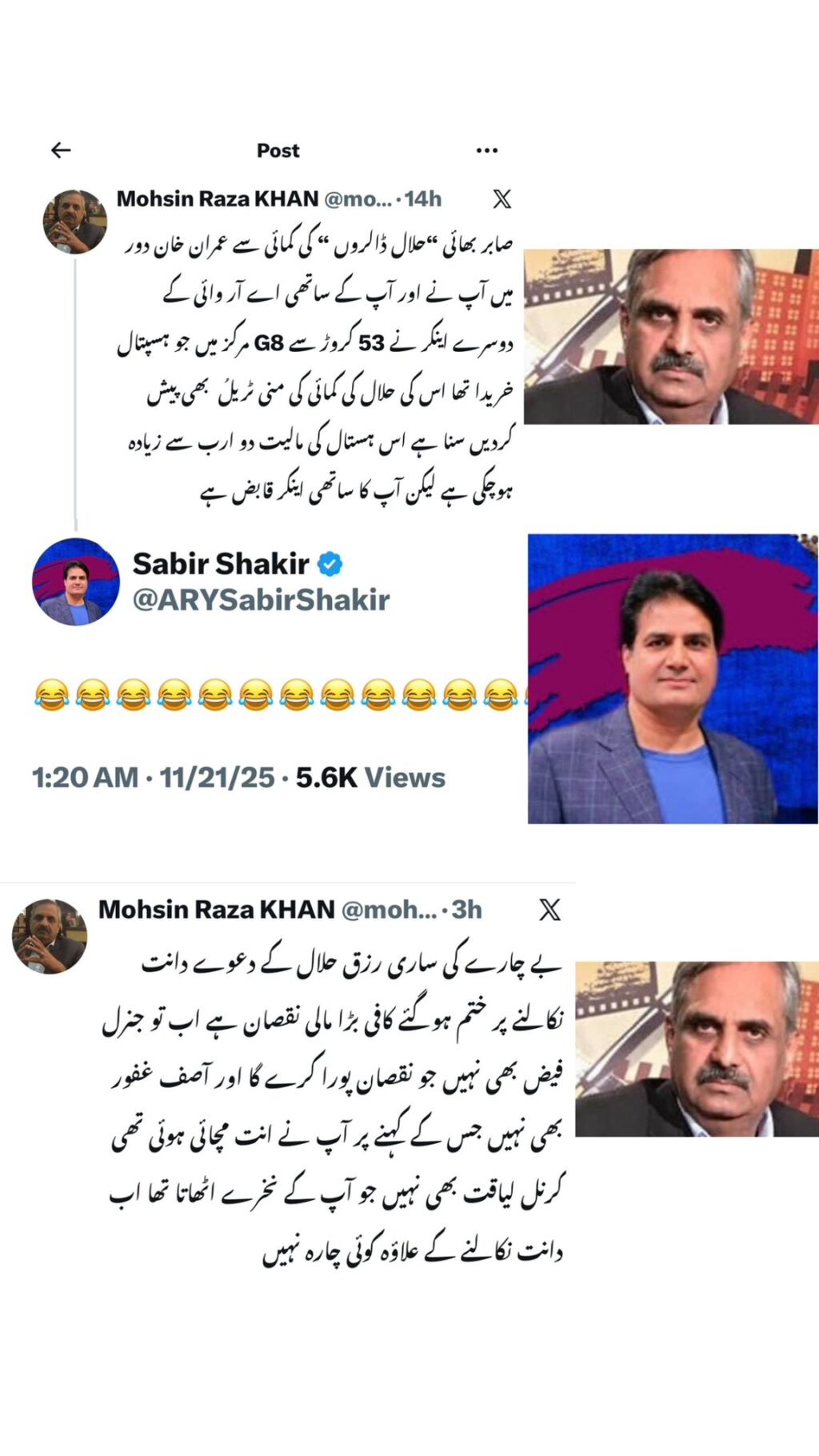 سابق ڈائریکٹر نیوز نے الزام عائد کیا کہ صابر شاکر کے رزقِ حلال کے بیانیے کا پول کھل چکا ہے، کیونکہ وہ اب تک اسپتال خریداری کی منی ٹریل پیش کرنے میں ناکام رہے ہیں۔ صابر شاکر کو ماضی میں بعض اعلیٰ عہدیداران کی پشت پناہی حاصل رہی، جن میں سابق ڈی جی آئی ایس آئی لیفٹیننٹ جنرل (ر) فیض حمید، سابق ڈی جی آئی ایس پی آر میجر جنرل آصف غفور اور بعض دیگر فوجی افسران کے نام بھی لیے جا رہے ہیں۔ محسن رضا خان کے مطابق ان ہی تعلقات کی بنیاد پر صابر شاکر نے مبینہ طور پر ’’انت مچائی‘‘ اور اثر و رسوخ استعمال کیا۔تاہم اب سابق افسران کے عہدوں سے ہٹ جانے کے بعد صورتحال بدل چکی ہے۔ محسن رضا خان کا کہنا ہے کہ صابر شاکر کو مالی نقصان کا سامنا ہے اور ’’دانت نکالنے‘‘ کا اشارہ اسی جانب ہے کہ وہ اپنی پوزیشن برقرار رکھنے میں ناکام ہو رہے ہیں۔