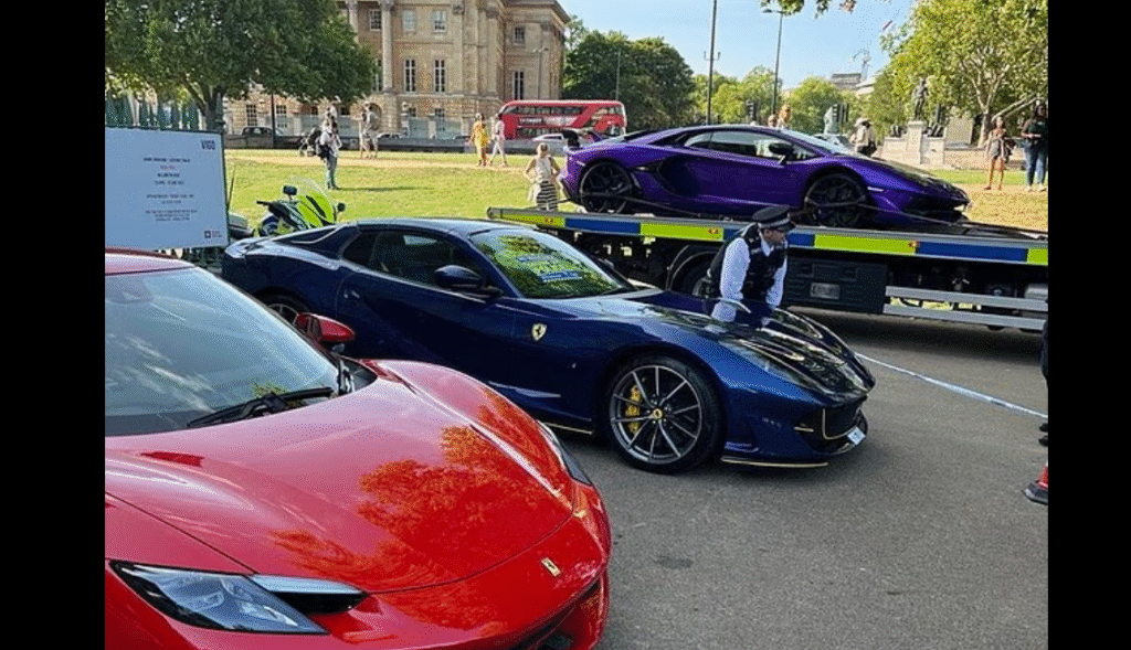 لندن ، پولیس نے لندن کے مختلف علاقوں سے 70 سے زائد قیمتی سپرکارز ضبط کر لیے ہیں جن کی مجموعی مالیت تقریباً سات ملین پاؤنڈ بنتی ہے۔ ان میں دو منفرد ارغوانی رنگ کی لیمبورگینی، فراریز اور پورشے گاڑیاں بھی شامل ہیں
