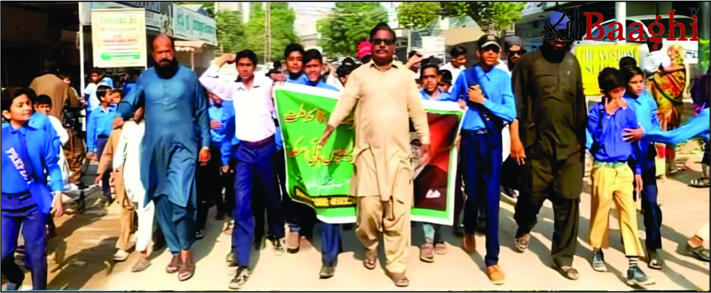 میرپورخاص،باغی ٹی وی(نامہ نگار سید شاہزیب شاہ)قائد ملت اسکول میں وطن سے محبت کا مظاہرہ، پاک فوج کی حمایت میں شاندار ریلی