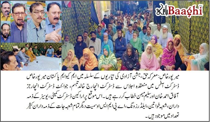 میرپورخاص (باغی ٹی وی نامہ نگار سید شاہزیب شاہ)ایم کیو ایم پاکستان میرپورخاص ڈسٹرکٹ آفس میں جشن آزادی کی تیاریوں کے سلسلے میں ایک اجلاس منعقد ہوا، جس سے خطاب کرتے ہوئے ڈسٹرکٹ انچارج خالد تبسم، جوائنٹ انچارجز آفاق احمد خان اور سلیم میمن نے اعلان کیا کہ "معرکہ حق، جشن آزادی” کو شہر بھر میں انتہائی جوش و خروش اور قومی جذبے سے منایا جائے گا۔
