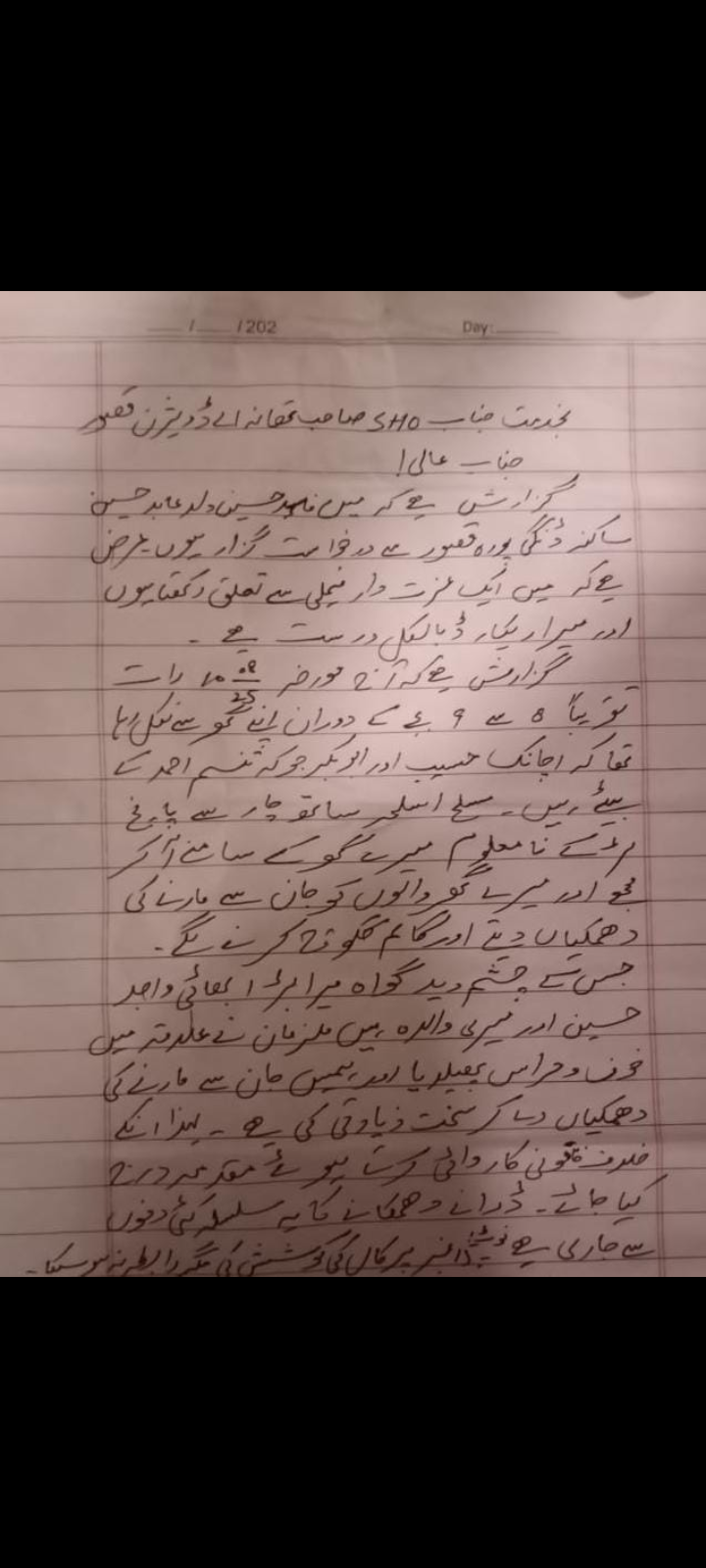 میں مورخہ 10 اگست 2025 رات 8 سے 9 بجے کے دوران اپنے گھر سے نکل رہا تھا کہ اچانک حسیب اور ابوبکر جو کہ تسنیم احمد کے بیٹے ہیں، اپنے چار سے پانچ  مسلح اسلحہ بردار لڑکوں کے ساتھ  میرے گھر کے سامنے آکر مجھے اور میرے گھر والوں کو جان سے مارنے کی دھمکیاں دیتے رہے اور گالم گلوچ کرتے رہے جس کے چشم دید گواہ میرا بڑا بھائی واحد حسین اور میری والدہ ہیں