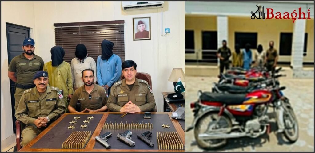 مظفرگڑھ (باغی ٹی وی،نامہ نگار) تھانہ سٹی مظفرگڑھ پولیس نے ایک بڑی کارروائی کے دوران چور گینگ کے تین ملزمان کو گرفتار کر لیا ہے، جن کے قبضے سے پانچ عدد چوری شدہ موٹرسائیکلیں، اسلحہ اور نقد رقم برآمد ہوئی ہے۔ اس کارروائی کا آغاز ڈسٹرکٹ پولیس آفیسر مظفرگڑھ ڈاکٹر رضوان احمد خان کی خصوصی ہدایت پر کیا گیا۔
