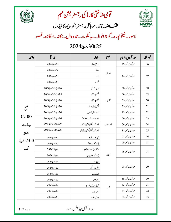 نادرا نے لاہور، گوجرانوالہ، سیالکوٹ، ناروال، شیخوپورہ، ننکانہ صاحب،اوکاڑہ اور قصور میں موبائل رجسٹریشن کا شیڈول جاری کیا ہے