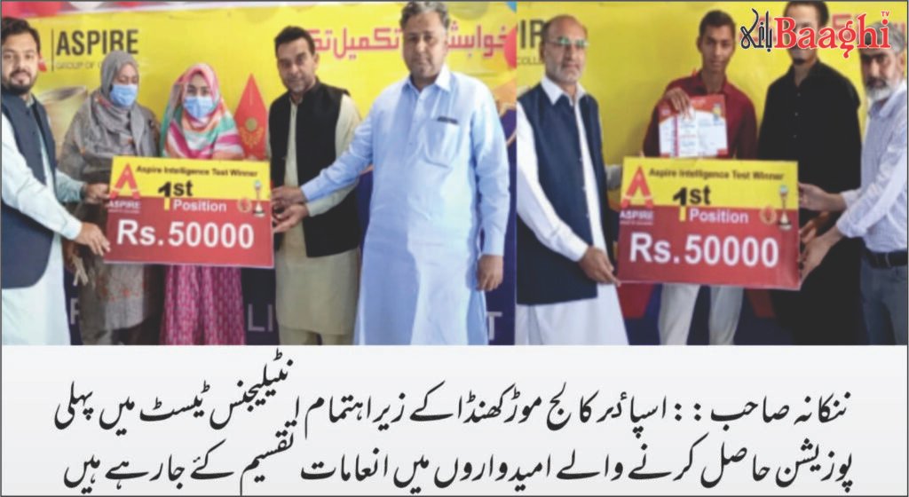 ننکانہ صاحب(نامہ نگاراحسان اللہ ایاز) اسپائر کالج موڑکھنڈا نے اپنے زیر اہتمام منعقدہ اسپائر انٹیلیجنس ٹیسٹ میں نمایاں پوزیشن حاصل کرنے والے طلباء و طالبات کے اعزاز میں ایک تقریب کا انعقاد کیا۔ تقریب کی صدارت کالج کے پرنسپل حافظ عظمت اللہ نے کی، جبکہ ڈائریکٹرز محمد طارق شہزاد، محمد امین آفتاب، محمد اشفاق، محمد بلال ارشد، فیض الرحمان پڈھیار، کرامت علی اور اساتذہ سمیت طلباء و طالبات کی کثیر تعداد نے شرکت کی۔