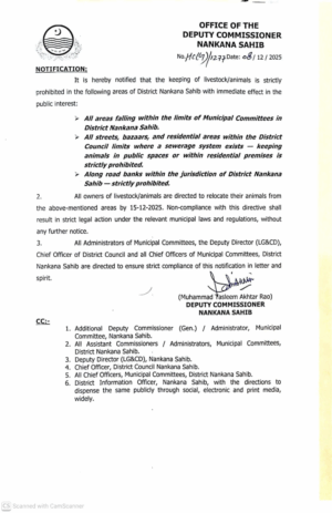 ترجمان کے مطابق ضلع ننکانہ صاحب کی ریونیو حدود میں سڑکوں کے کنارے جانور باندھنا بھی ممنوع قرار دے دیا گیا ہے۔ انتظامیہ نے تمام مویشی مالکان کو 15 دسمبر 2025 تک اپنے جانوروں کو رہائشی علاقوں سے منتقل کرنے کی ہدایت کی ہے۔