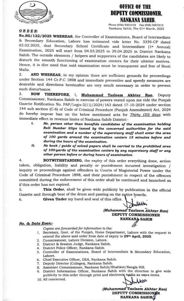 ننکانہ صاحب،باغی ٹی وی(نامہ نگاراحسان اللہ ایاز) ڈپٹی کمشنر محمد تسلیم اختر راؤ نے امتحانی مراکز کی سیکیورٹی اور شفافیت کو یقینی بنانے کے لیے دفعہ 144 نافذ کر دی۔
