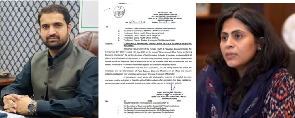 بعد ازاں چیف ایگزیکٹو آفیسر ڈسٹرکٹ ہیلتھ اتھارٹی ننکانہ صاحب ڈاکٹر روحیل اختر نے بھی خط نمبر 18,360–65 IG مورخہ 20 اگست 2025 کے ذریعے ڈسٹرکٹ ہیلتھ آفیسرز، ڈپٹی ڈسٹرکٹ ہیلتھ آفیسرز، IRMNCH آفس اور دیگر دفاتر کو فوری طور پر فیس اسکینر مشینوں کی تنصیب کا حکم دیا تھا۔ تاہم اس خط کو بھی 20 دن گزرنے کے باوجود کسی دفتر میں عملدرآمد نہ ہو سکا۔