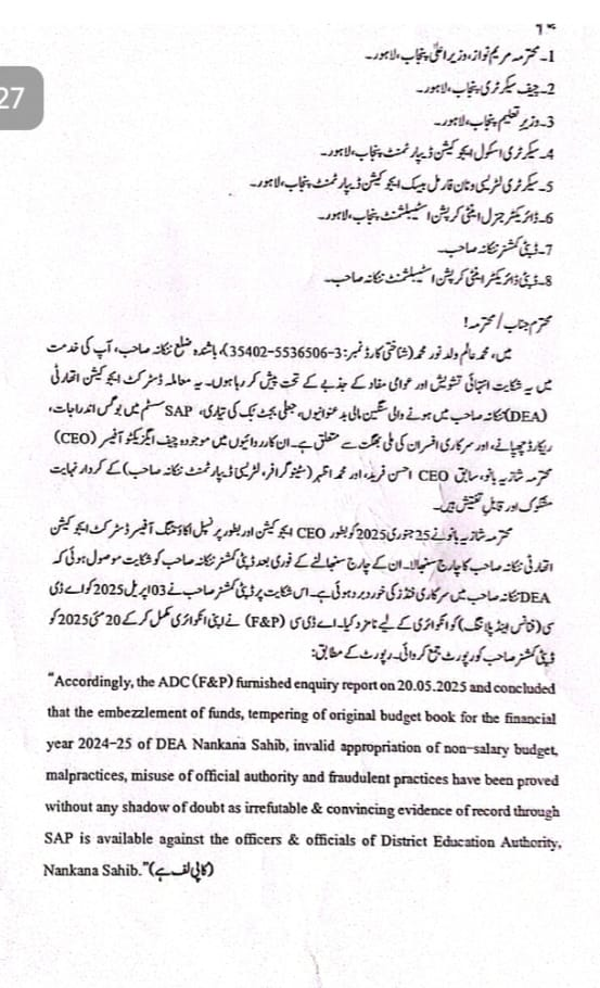 ننکانہ صاحب (باغی ٹی وی نامہ نگار احسان اللہ ایاز)ڈسٹرکٹ ایجوکیشن اتھارٹی ننکانہ صاحب میں مالی سال 2024-25 کے دوران کروڑوں روپے کے فنڈز میں مبینہ خوردبرد، بجٹ میں ٹیمپرنگ اور SAP سسٹم میں جعلی اندراجات کے سنگین انکشافات سامنے آئے ہیں۔