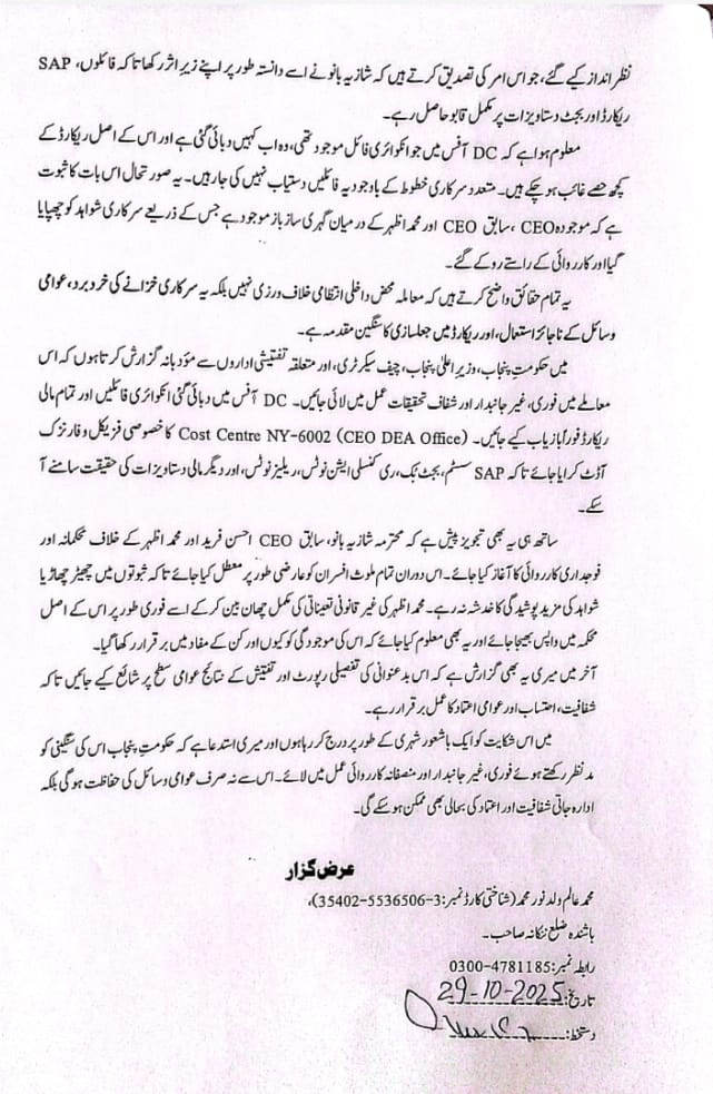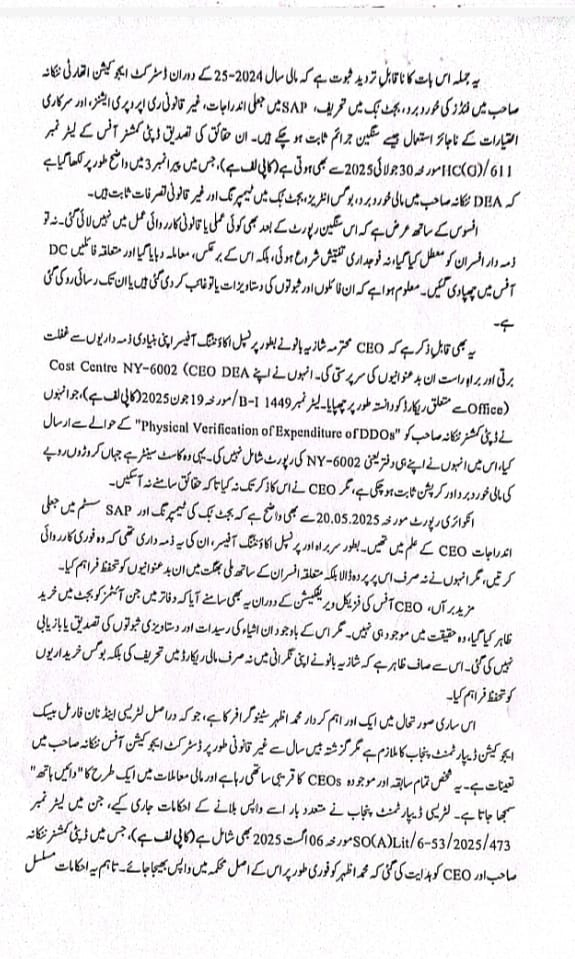 ذرائع کے مطابق شہری محمد عالم کی شکایت پر 3 اپریل 2025 کو ایڈیشنل ڈپٹی کمشنر (فنانس اینڈ پلاننگ) نے انکوائری افسر مقرر کیا، جنہوں نے 20 مئی 2025 کو اپنی رپورٹ میں واضح کیا کہ فنڈز میں غبن، بجٹ کتاب میں تبدیلیاں اور SAP میں جعلی اندراجات کے ناقابلِ تردید شواہد موجود ہیں۔