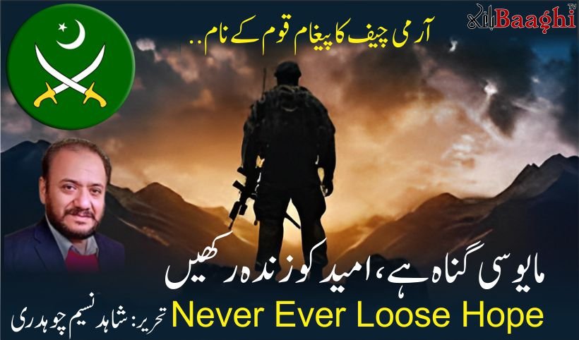 آرمی چیف جنرل سید عاصم منیر کا یہ پیغام کہ "مایوسی گناہ ہے، امید کو زندہ رکھیں” نہ صرف موجودہ حالات میں قوم کے لیے حوصلے اور رہنمائی کا ذریعہ ہے بلکہ اسلامی تعلیمات اور ہماری قومی تاریخ کے مطابق بھی ایک اہم پیغام ہے۔ یہ پیغام قوم کے لیے روشنی کی کرن ہے، جو مشکل حالات میں اتحاد اور عزم کے ساتھ آگے بڑھنے کی تاکید کرتا ہے۔