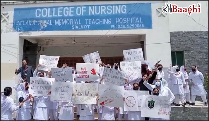 سیالکوٹ (باغی ٹی وی ڈویژنل بیوروچیف شاہد ریاض)سیالکوٹ میں گورنمنٹ علامہ اقبال ٹیچنگ میموریل ہسپتال کے گرلز ہاسٹل کے باہر نرسنگ کی طالبات نے ہائر ایجوکیشن کمیشن (ایچ ای سی) کی نئی پالیسی کے خلاف بھرپور احتجاجی مظاہرہ کیا۔ طالبات کا مطالبہ ہے کہ ایچ ای سی نے نرسنگ کے پاسنگ مارکس 50 فیصد سے بڑھا کر اچانک 60 فیصد کر دیے ہیں، جس کے باعث انہیں شدید مشکلات کا سامنا ہے۔