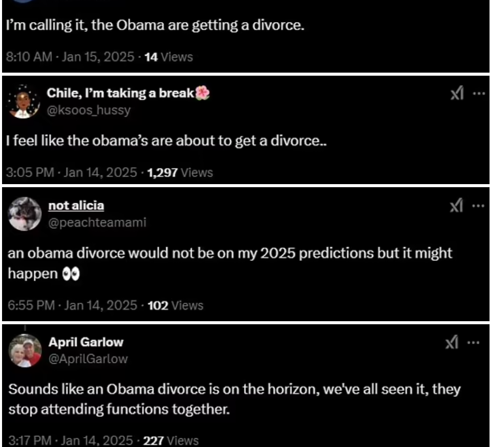 یہ دونوں بڑی غیر حاضریاں بعض مداحوں میں تشویش پیدا کر رہی ہیں، جنہوں نے سوشل میڈیا پر اپنے خیالات کا اظہار کیا۔ ایک صارف نے لکھا، "میں تو کہہ رہا ہوں، اوباما کی طلاق ہونے والی ہے۔” ایک اور نے کہا، "اوباما کی طلاق 2025 کی پیش گوئیوں میں شامل نہیں تھی، مگر اب ایسا لگتا ہے کہ یہ ہو سکتی ہے۔” ایک اور نے دعویٰ کیا، "مشیل اور باراک کے درمیان اب کچھ ٹھیک نہیں ہے! وہ طلاق لینے والے ہیں! وہ ایک دوسرے کے ساتھ نہیں رہنا چاہتی ہیں!”
