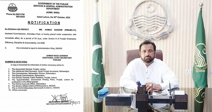 گورنمنٹ آف پنجاب سروس اینڈ جنرل ایڈمنسٹریشن ڈیپارٹمنٹ کے ایڈمن ونگ کی طرف جاری شدہ لیٹرنمبرSO(Admn-II)4-355/2017جاری شدہ 30 اکتوبر2023جس میں لکھاگیا ہے کہ مسٹراحمدندیم سکیل 17 اسسٹنٹ کمشنراحمدپورشرقیہ کوفوری طورپر90 دن کیلئے معطل کردیاگیا ہے,