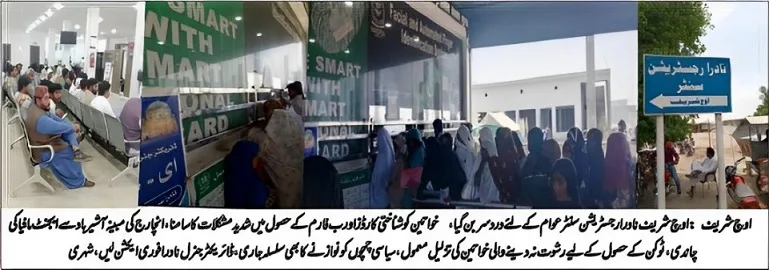 اوچ شریف ،باغی ٹی وی(نامہ نگارحبیب خان) نادرا رجسٹریشن سنٹر عوام کے لئے درد سر بن گیا، خواتین کو شناختی کارڈز اور ب فارم کے حصول میں شدید مشکلات کا سامنا، انچارج ذوالقرنین کی مبینہ آشیرباد سے ایجنٹ مافیا کی چاندی، ٹوکن کے حصول کے لیے رشوت نہ دینے والی خواتین کی تذلیل معمول، سیاسی چمچوں کو نوازنے کا سلسلہ بھی جاری، ڈی جی نادرا فوری ایکشن لیں، شہریوں کامطالبہ،