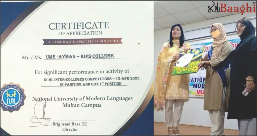15 اپریل 2025 کو منعقد ہونے والے اس قومی سطح کے باوقار مقابلے میں ملک بھر کے نامور تعلیمی اداروں کے ذہین طلبہ و طالبات نے حصہ لیا۔ سخت مقابلے اور ججز کے لیے مشکل ترین فیصلہ کن لمحات کے باوجود امِ ایمن کا تخلیقی فن پارہ، رنگوں کے ذریعے اپنی کہانی بیان کرنے کا بے مثال ہنر اور دیکھنے والوں کے دلوں کو چھو لینے والی فنکارانہ مہارت سب پر غالب آ گئی۔ ان کی اس شاندار اور منفرد کارکردگی پر NUML ملتان کیمپس کے ڈائریکٹر بریگیڈیئر (ر) اسد رضا نے انہیں خصوصی "سرٹیفیکیٹ آف اپریسی ایشن” پیش کیا اور ان کی بے پناہ قابلیت اور انتھک محنت کو دل کی گہرائیوں سے خراجِ تحسین پیش کیا۔