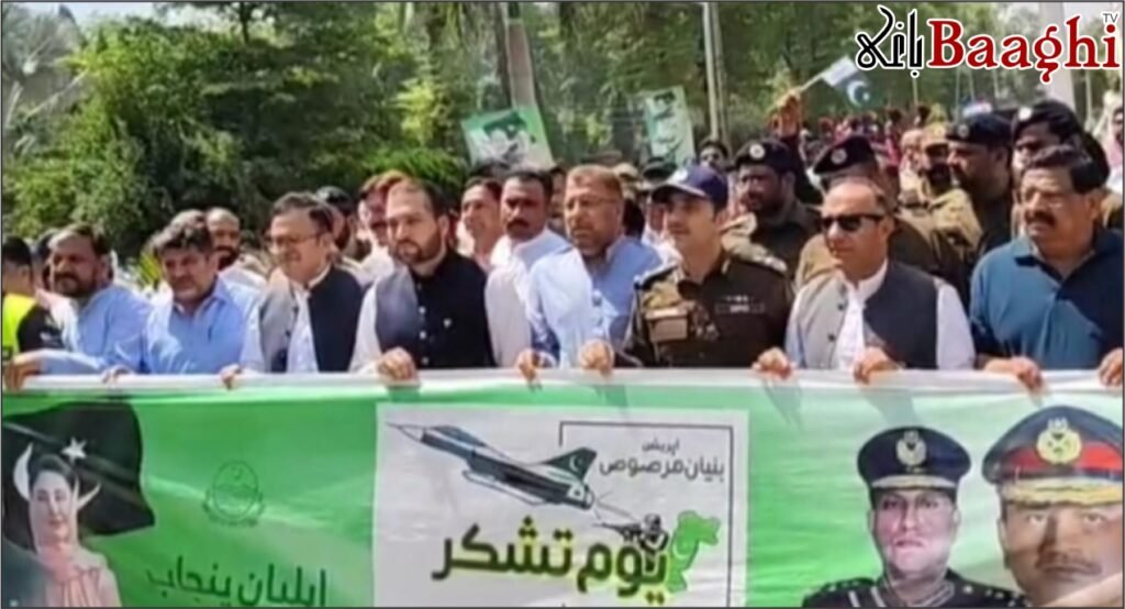 پولیس کے چاک و چوبند دستے نے سلامی دی، قومی ترانہ بجایا گیا، اور ریلی میں پاک فوج زندہ باد کے نعرے لگائے گئے۔ تقریب سے خطاب میں صوبائی وزیر عاشق کرمانی نے کہا کہ جنرل عاصم منیر کی قیادت میں افواج پاکستان نے بھارت کو منہ توڑ جواب دے کر قوم کا سر فخر سے بلند کر دیا۔ ایم پی اے غلام رضا ربیرہ نے کہا کہ مشن بنیان مرصوص نے بھارتی ایر ڈیفنس سسٹم کو ناکارہ بنا کر دشمن کا غرور خاک میں ملا دیا۔ ڈپٹی کمشنر احمد عثمان جاوید نے کہا کہ سرکاری سطح پر یوم تشکر منایا جا رہا ہے اور تعلیمی و مذہبی اداروں میں خصوصی دعائیں ہوں گی۔