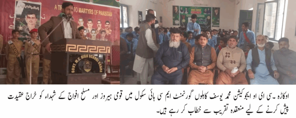 اوکاڑہ (نامہ نگار ملک ظفر)سرکاری سکولوں میں جذبۂ حب الوطنی کے فروغ کے لیے گورنمنٹ ایم سی ہائی سکول اوکاڑہ میں چیف ایگزیکٹو آفیسر ڈسٹرکٹ ایجوکیشن اتھارٹی محمد یوسف کاہلوں کی زیر صدارت ایک پروقار تقریب منعقد کی گئی۔ تقریب میں پرنسپل، اساتذہ اور طلبہ کی بڑی تعداد نے شرکت کی۔