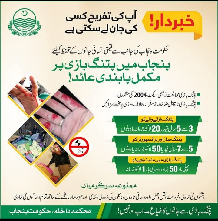 انسانی جانوں کے تحفظ کیلئے پتنگ بازی پر مکمل پابندی کا قانون منظور کروایا گیا ہے اور فوری طور پر تمام پولیس افسران کو مطلع کرکے کاروائی کرنے کا پابند کر دیا گیا ہے