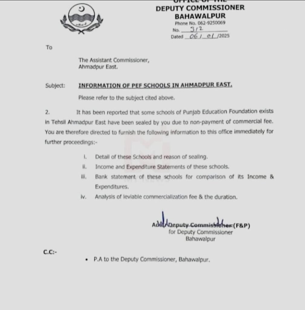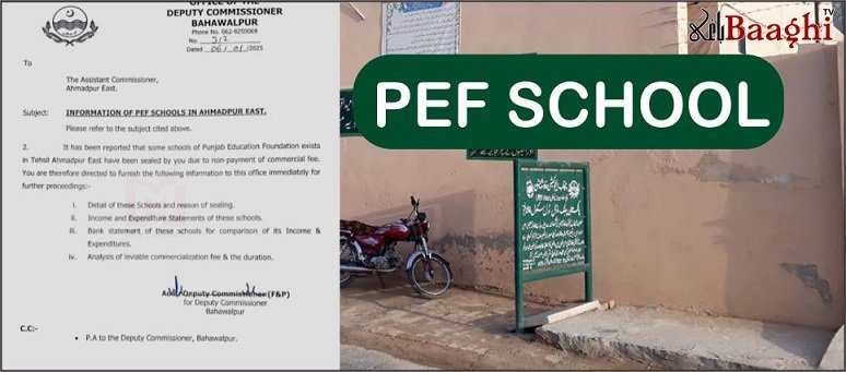 اوچ شریف باغی ٹی وی نامہ ( نگار حبیب خان) تحصیل احمدپور شرقیہ میں پنجاب ایجوکیشن فاؤنڈیشن (پیف) کے تحت چلنے والے کئی اسکول کمرشل فیس کی عدم ادائیگی پر سیل کر دیے گئے ہیں۔ ڈپٹی کمشنر بہاولپور کی جانب سے اسسٹنٹ کمشنر احمدپور شرقیہ کو ان اسکولوں کی تفصیلات فراہم کرنے کا حکم دیا گیا ہے۔