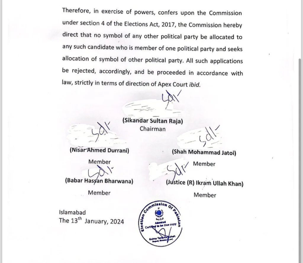 الیکشن کمیشن کی جانب سے کہا گیا ہے کہ اکثر امیدواروں کی جانب سے درخواستیں موصول ہوئی ہیں،ان درخواستوں کے ذریعے سے الیکشن کمیشن کو دھوکا دیا جارہا ہے، الیکشن کمیشن کو دھوکا دے کر قانون کی خلاف ورزی کی جارہی ہے، الیکشن کمیشن حکم دیتا ہے کہ کوئی انتخابی نشان کسی دوسرے پارٹی کے امیدوار کو نہ دیا جائے،جو امیدوار کسی اور جماعت کا ممبر ہو اور دوسری جماعت کا نشان مانگے وہ نہ دیاجائے،آر اوز ایسے کسی امیدوار کو دوسرا انتخابی نشان نہ دیں،الیکشن ایکٹ کے تحت امیدوار اپنی پارٹی وابستگی کا سرٹیفکیٹ دیتا ہے،ایک شخص ایک وقت میں ایک سے زیادہ پارٹی کا رکن نہیں ہوسکتا،