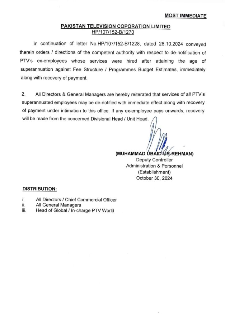 ریٹائرمنٹ کے بعد پی ٹی وی میں دوبارہ ملازمت والے 14 افسران کو فارغ کردیا