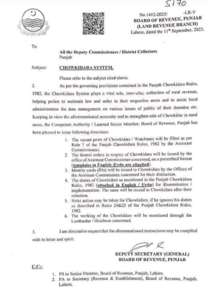 بورڈ اف ریونیو پنجاب لینڈریونیو نے نوٹیفکیشن جاری کیا ہے جس کے تحت پنجاب کے دیہاتوں میں چوکیدار رات کو پہرا بھی دیا کریں گے اور دن میں اپنے فرائض منصبی بھی سر انجام دیں گے