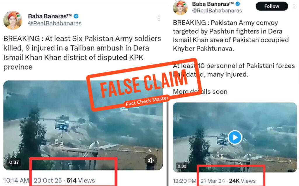 راسے منسلک ایک ہندوستانی اکاؤنٹ نے پہلی بار یہی ویڈیو 21 مارچ 2024 کو پوسٹ کی تھی ،جس میں ڈیرہ اسماعیل خان میں ٹی ٹی پی کے حملے کا دعویٰ کیا گیا تھا۔ اسی اکاؤنٹ نے اب 20 اکتوبر 2025 کو ایک نئی من گھڑت کہانی کے ساتھ ایک جیسی فوٹیج کو ری سائیکل کیا ہے۔ کم از کم پروپیگنڈے اور پرانی فوٹیج کو دوبارہ استعمال کرنے کا کوئی معیار ہونا چاہیے لیکن ان بھارتی را کے پروپیگنڈا اکاؤنٹس کے پاس واضح طور پر کوئی نہیں ہے۔