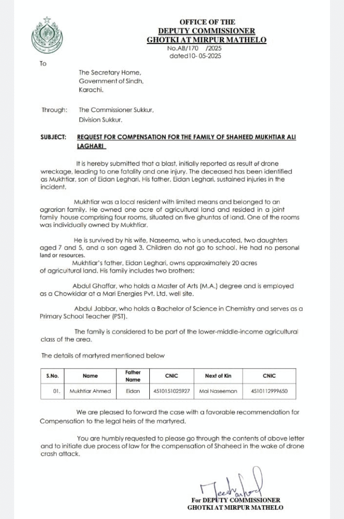 تفصیل کے مطابق ڈپٹی کمشنر گھوٹکی ڈاکٹر سید محمد علی نے بھارتی ڈرون کے تباہ ہونے سے شہید ہونے والے شہری مختیار احمد لغاری کے لواحقین کو معاوضہ فراہم کرنے کے لیے حکومت سندھ کو مراسلہ ارسال کر دیا۔ یہ سفارش سیکریٹری داخلہ سندھ کو بھجوائی گئی ہے تاکہ متاثرہ خاندان کی مالی معاونت ممکن بنائی جا سکے۔