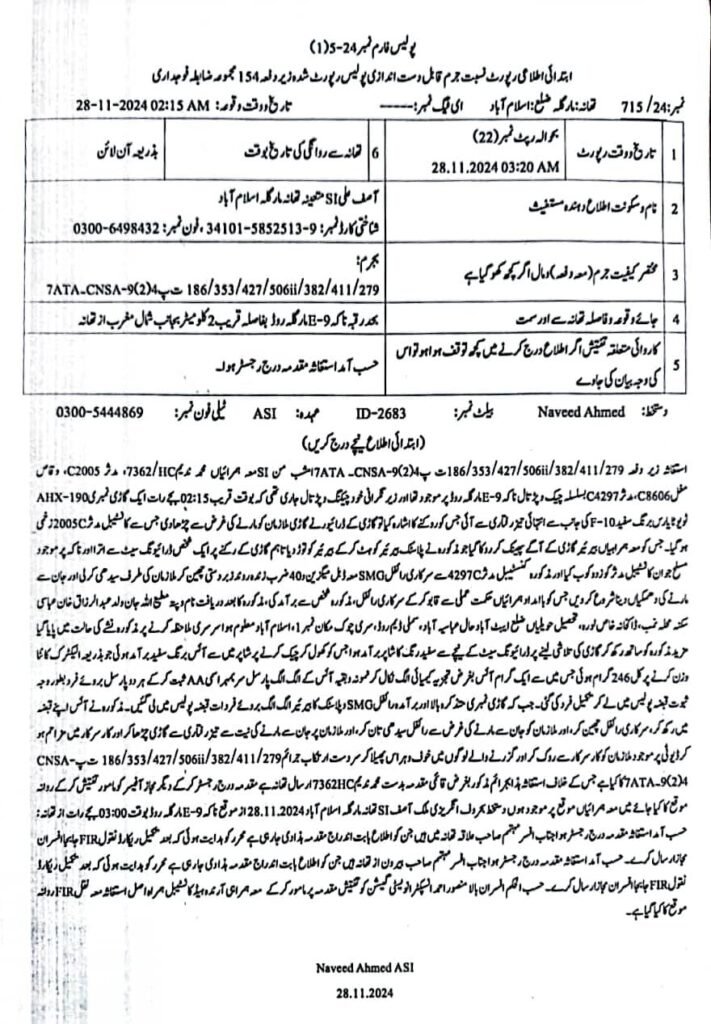 میڈیا رپورٹس کے مطابق اسلام آباد پولیس نے مطیع اللہ جان کو گرفتار کرکے تھانہ مارگلہ میں منتقل کر دیا ہے، مطیع اللہ جان کے خلاف مقدمہ درج کر لیا گیا ہے،مقدمہ تھانہ مارگلہ اسلام آباد میں درج کیا گیا ہے،مقدمہ سب انسپکٹر آصف علی کی مدعیت میں درج کیا گیا،درج مقدمہ میں کہا گیا کہ بسلسلہ چیک و پڑتال نا کہ 9 مارگلہ روڈ پر موجود تھا چیکنگ و پڑتال جاری تھی کہ بوقت قریب 02:15 بجے رات ایک گاڑی نمبری 190-AHXٹویوٹا پارس بر تنگ سفید 10-F کی جانب سے انتہائی تیزرفتاری سے آئی جس کو روکنے کا اشارہ کیا تو گاڑی کے ڈرائیور نے گاڑی ملازمین کو مارنے کی غرض سے چڑھادی جس سے کانسٹیبل مدثر زخمی ہو گیا،پولیس کی جانب سے بیریئر آگے کر کے روکا گیا، تاہم گاڑی کے رکنے پر ایک شخص ڈرائیونگ سیٹ سے اترا اور ناکہ پر موجودمسلح جو ان مدثر 4297 سے سرکاری رائفل ایس ایم جی بمعہ میگزین زبردستی چھینی اور ملا زمین کی طرف سیدھی کر لی اور جان سےمارنے کی دھمکیاں دینا شروع کر دیں،جس کو حکمت عملی سے قابو کر کے سرکاری رائفل برآمد کی، مذکورہ شخص کی شناخت مطیع اللہ جان،ولد عبدالرزاق خان عباسی کے طور پر ہوئی.سرسری ملاحظہ کرنے پر مذکورہ نشے میں پایا گیا،گاڑی کی تلاشی لینے پر سیٹ کے نیچے سے سفید شاپر برآمد ہوا جس سے تلاشی لینے پر 256 گرام آئس برآمد ہوئی،