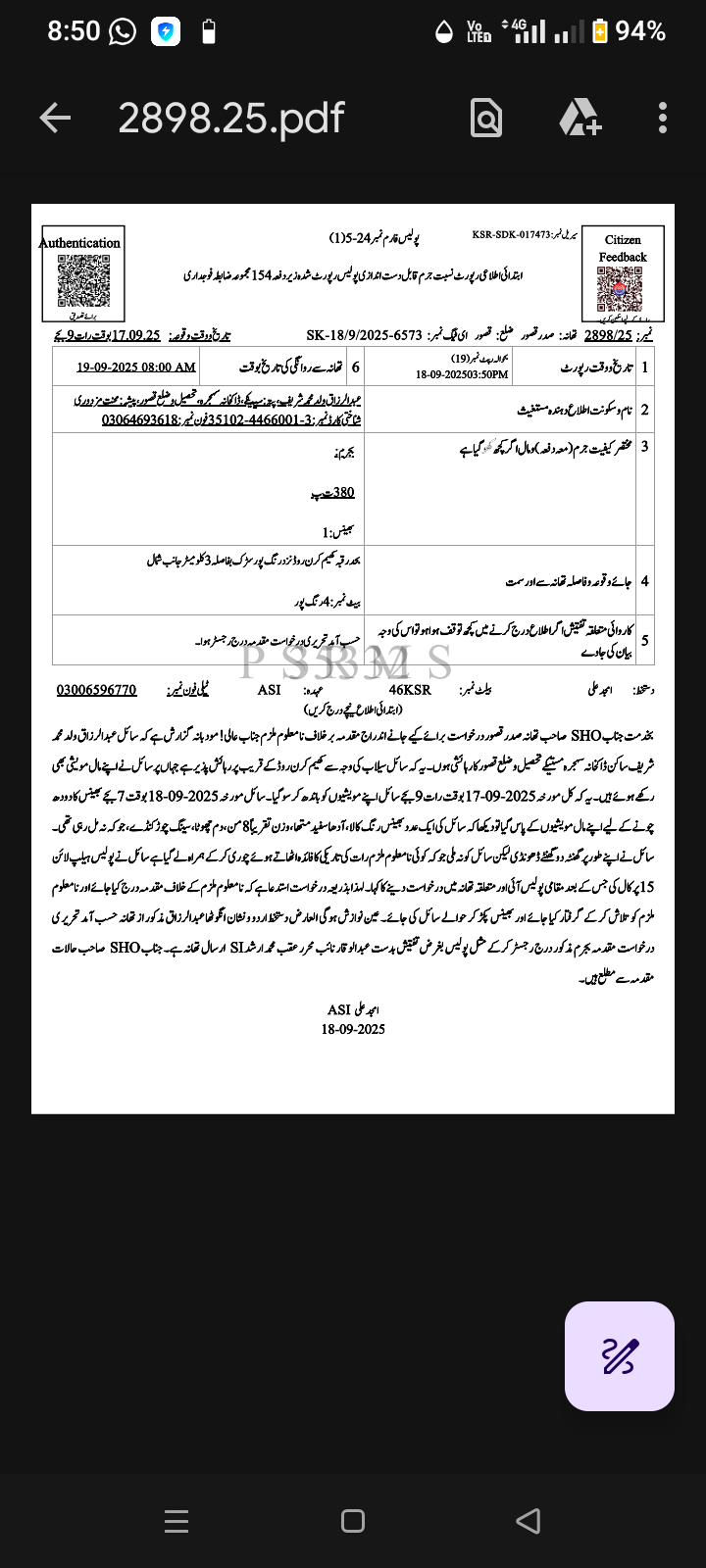 تفصیلات کے مطابق عبد الرزاق ولد محمد شریف ساکن ڈاکخانہ سہجره مستیکے تحصیل و ضلع قصور نے ایس ایچ او تھانہ صدر قصور کو درخواست دی کی سائل سیلاب کی وجہ سے کھیم کرن روڈ کے قریب پر رہائش پذیر ہے جہاں پر سائل نے اپنے مال مویشی بھی رکھے ہوئے ہیں مورخہ 2025-09-17 بوقت رات 9 بجے سائل اپنے مویشیوں کو باندھ کر سو گیا اگلے دن مورخہ 2025-09-18 بوقت 7 بچے بھینس کا دودھ دھونے کے لیے اپنے مال مویشیوں کے پاس گیا تو دیکھا کہ سائل کی ایک عدد بھینس رنگ کالا، آدھا سفید ماتھا، وزن تقریباً 8 من ، دم چھوٹی غائب تھی سائل نے اپنے طور پر گھنٹہ دو گھنٹے ڈھونڈی لیکن سائل کو نہ ملی جو کہ کوئی نامعلوم ملزم رات کی تاریکی کا فائدہ اٹھاتے ہوئے چوری کر کے ہمراہ لے گیا ہے سائل نے پولیس ہیلپ لائن 15 پر کال کی جس کے بعد مقامی پولیس آئی اور متعلقہ تھانہ میں درخواست دینے کا کہا