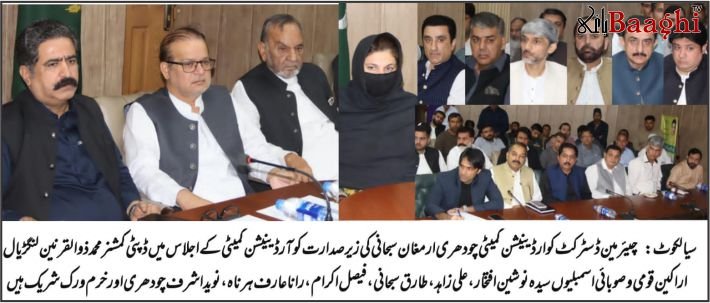 سیالکوٹ (باغی ٹی وی،بیوروچیف شاہد ریاض) رکن قومی اسمبلی چودھری ارمغان سبحانی کی زیر صدارت ڈسٹرکٹ کوآرڈینیشن کمیٹی سیالکوٹ کا اجلاس ڈی سی آفس کمیٹی روم میں منعقد ہوا۔ اجلاس میں ڈپٹی کمشنر محمد ذوالقرنین لنگڑیال، قومی و صوبائی اسمبلی کے اراکین علی زاہد، سیدہ نوشین افتخار، محمد منشاء اللہ بٹ، چودھری فیصل اکرام، اور دیگر متعلقہ افسران نے شرکت کی۔ اجلاس میں ضلع سیالکوٹ میں جاری ترقیاتی منصوبوں کی تفصیلات دی گئیں۔