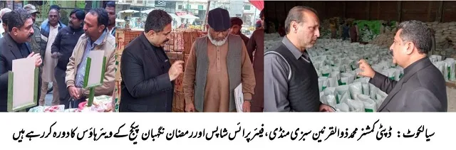 ڈپٹی کمشنر سیالکوٹ نے ماڈل بازار (تحصیل بازار) میں قائم ایگریکلچر فیئر پرائس شاپس کا دورہ کیا اور وہاں پر سبزیوں و پھلوں اور پولٹری کی مصنوعات کی رعائتی داموں کیلئے محکمہ زراعت اور لائیو سٹاک کی جانب سے لگائے گئے اسٹالز کا معائنہ کیا اور ہدایت کی کہ ماہ رمضان میں معیاری سبزیاں، پھلوں، گوشت اور پولٹری کی کنٹرول ریٹ کی فراہمی کو یقینی بنانے کیلئے متعلقہ ڈیپارٹمنٹ اپنی ذمہ داری جانفشانی اور جذبے سے انجام دیں۔
