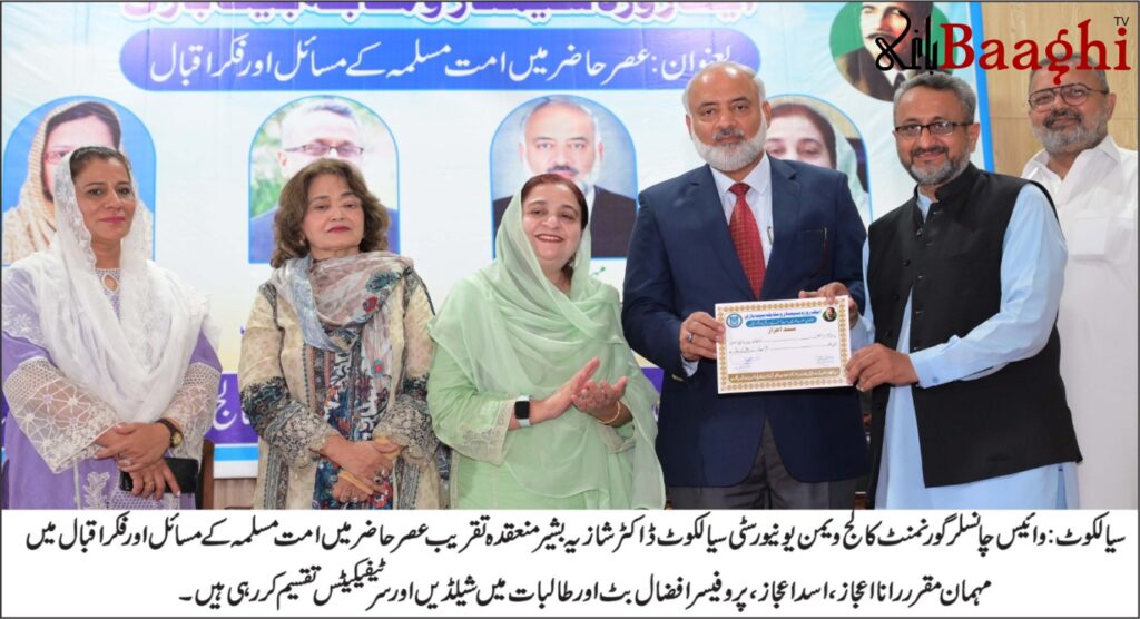 سیالکوٹ (باغی ٹی وی، بیوروچیف شاہد ریاض)گورنمنٹ کالج ویمن یونیورسٹی سیالکوٹ میں شاعر مشرق علامہ محمد اقبال کے یوم وفات کے موقع پر "عصرِ حاضر میں اُمتِ مسلمہ کے مسائل اور فکرِ اقبال” کے عنوان سے ایک فکری و ادبی سیمینار کا انعقاد کیا گیا۔ اس تقریب کا اہتمام اقبال چئیر، ڈائریکٹوریٹ آف سٹوڈنٹس افیئرز، اوورِک اور شعبہ اردو کے باہمی تعاون سے کیا گیا۔
