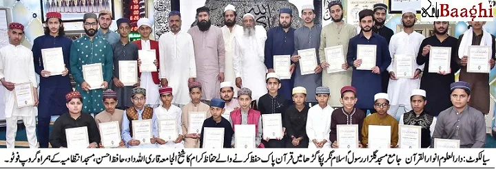 سیالکوٹ،باغی ٹی وی (بیوروچیف شاہد ریاض سے)دارالعلوم انوارا لقرآن جامعہ مسجد گلزار رسول ، اسلام نگر پکا گڑھا سیالکوٹ میں قرآن پاک مکمل حفظ کرنے والے آٹھ خوش نصیب حفاظ کرام کو شیخ الجامعہ قاری اللّٰہ داد ، مسجد انتظامیہ معزز ین علاقہ نے اپنے ہاتھوں سند حفظ قرآن پاک عطا کیں