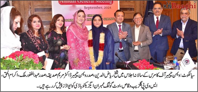 سیالکوٹ (باغی ٹی وی بیوروچیف شاہد ریاض)سیالکوٹ میں ویمن چیمبر آف کامرس اینڈ انڈسٹری (WCCI) کا سالانہ جنرل باڈی اجلاس (AGM) الشفیع آڈیٹوریم ہال میں منعقد ہوا۔ اجلاس کی صدارت ویمن چیمبر کی صدر ڈاکٹر مریم صدیقہ نے کی، جبکہ اس موقع پر سیالکوٹ کی تاجر برادری کے قائدین اور دیگر اہم شخصیات بھی موجود تھیں۔