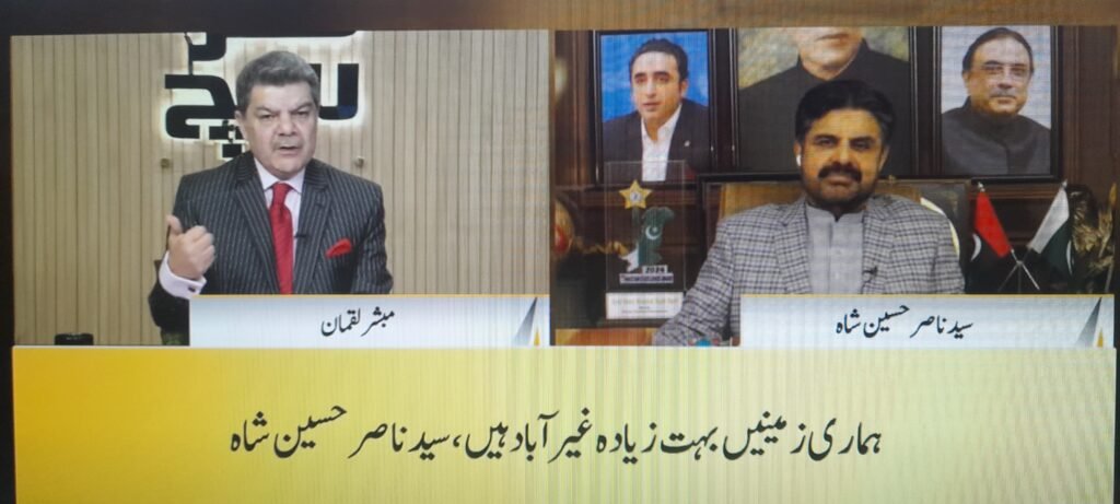 سید ناصر حسین شاہ کا مزید کہنا تھا کہ کھالوں کو پکا کرنے کا سب سے زیادہ کام سندھ میں ہوا بھارت نے ہمارے پانیوں پر قبضہ کیا بین الاقوامی سطح پر آواز اٹھائی جائے۔ پانی کی کمی کچھ سالوں میں ہو جائے گی بین الاقوامی عدالت یا اقوام متحدہ میں آواز اٹھانا ہو گی۔ بھارت کو بین الاقوامی قوانین پر عمل کرنا یو گا ۔ غلط کام کرنے والے کو سزا ہونی چاہیے ہماری زمینیں بہت زیادہ غیر آباد ہیں کالا باغ ڈیم کے حوالہ سے جھوٹی کہانیاں گھڑی گئیں دو بڑے سیلاب 2010 اور 2022 میں آئے ۔ ہم چاہتے ہیں انتشار نہ ہو ملک آگے بڑھ رہا ہے۔ ایس آئی ایف سی کا جو کردار ہے اسکو سپورٹ کرتے ہیں لیکن اگر ایک آدھ منصوبے سے اس طرح کا ماحول بنتا یے تو اسے دوسری طرح بھی دیکھا جا سکتا ہے جیسے میں نے کہا کہ ہماری زمینیں حاضر ہیں۔ چولستان بھی آباد ہونا چاہیے۔ ہم بات کرنے کے لیے تیار ہیں۔ زمین آباد کرنی یے اور دارومدار پانی پر ہے تو پھر وہ علاقہ جہاں زمین ہو جیسے ہمارے پاس تھر ہے ہم دینے کو تیار ہیں اگر اس پر بات نہیں کی گئی تو کی جائے گی ۔ جب ہم مل کر بیٹھتے ہیں تو مسائل ہو سکتے ہیں۔ ایس آئی ایف سی کو ہم سپورٹ کرتے ہیں متنازعہ منصوبوں کو ریویو کرنے کی ضرورت ہے تاکہ کوئی حل نکلے ۔ انڈس سے پانی نکلنے پر ہمیں اعتراض ہو گا ۔ کیونکہ پانی کم ہو گا پینے کے پانی کا بھی اسی پر انحصار ہوتا ہے ۔ حقائق پر مبنی ایشو ہیں ہم پاکستان کے لیے سب کچھ کرنے کو تیار ہیں
