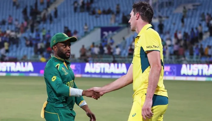 کولکتہ کے ایڈن گارڈنز میں کھیلے جارہے اس میچ میں جنوبی افریقہ نے ٹاس جیت کر پہلے بیٹنگ کرنے کا فیصلہ کیا۔ اس سے قبل ٹاس کے بعد گفتگو کرتے ہوئے جنوبی افریقا کے کپتان ٹیمبا باووما نے کہا کہ میں 100 فیصد فٹ نہیں ہوں لیکن کھیلنے کے قابل ہوں، آج میچ کے لیے ٹیم میں ایک تبدیلی کی ہے۔اس کے بعد آسٹریلیا کے کپتان پیٹ کمنز نے بتایا کہ ٹیم میں 2 تبدیلیاں کی ہیں اور اگر ہم ٹاس جیتتے تو پہلے بیٹنگ ہی کرتے۔