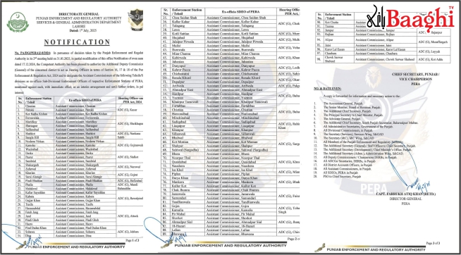 ڈائریکٹوریٹ جنرل پنجاب انفورسمنٹ اینڈ ریگولیٹری اتھارٹی کی جانب سے جاری کردہ نوٹیفکیشن کے مطابق، پیرا کے دوسرے اجلاس مورخہ 31 مئی 2025 کی روشنی میں، اور پہلے جاری کردہ نوٹیفکیشن (مورخہ 17 دسمبر 2024) میں ترامیم کے بعد، تمام اضلاع کے ایڈیشنل ڈپٹی کمشنرز جنرل (ADC-G) کو پیرا ایکٹ کی سیکشن 16، 17 اور 18 کے تحت ہیئرنگ آفیسر نامزد کیا گیا ہے۔ اس کے ساتھ ساتھ ہر تحصیل کے اسسٹنٹ کمشنر کو پیرا کا ایکس آفیشیو سب ڈویژنل انفورسمنٹ آفیسر مقرر کر دیا گیا ہے۔