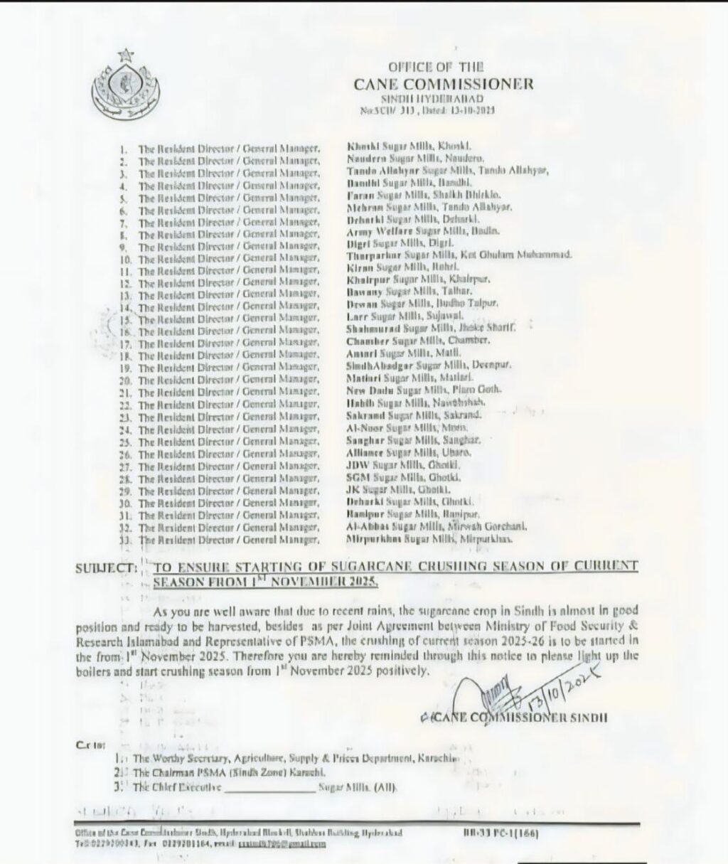 نوٹیفکیشن میں کہا گیا ہے کہ حالیہ بارشوں کے بعد سندھ میں گنے کی فصل بہترین حالت میں ہے اور کٹائی کے لیے مکمل طور پر تیار ہے۔ وزارتِ فوڈ سیکیورٹی اینڈ ریسرچ اسلام آباد اور پی ایس ایم اے (سندھ زون) کے نمائندوں کے درمیان طے پانے والے معاہدے کے مطابق موجودہ سیزن کی کرشنگ یکم نومبر 2025 سے شروع کی جائے گی۔