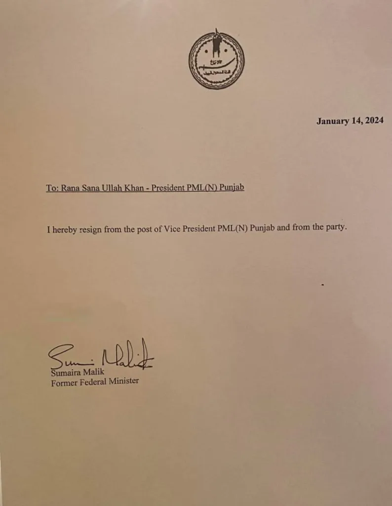 سابق وفاقی وزیر سمیرا ملک نے پارٹی کی رکنیت سے بھی استعفٰی دے دیا،سمیرا ملک نے این اے 87 پر ٹکٹ کے لئے اپلائی کیا تھا،پارٹی نے دوسرے لیگی امیدوار شاکر بشیر اعوان کو ٹکٹ جاری کر دیا،سمیرا ملک نے کاغذات نامزدگی بھی واپس لے لئے تھے،