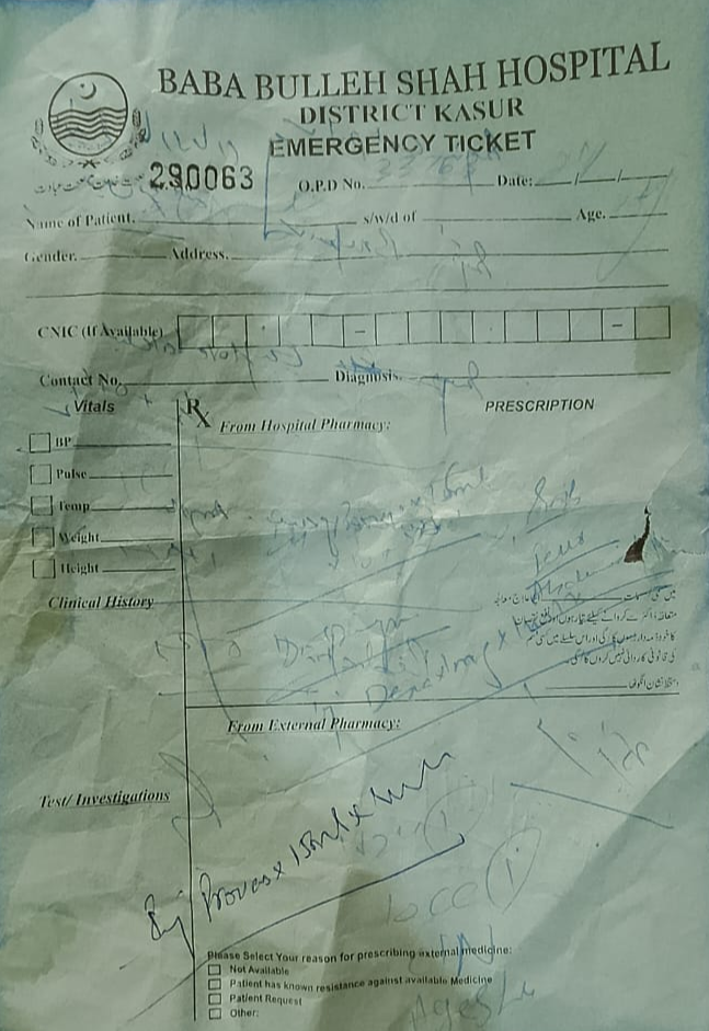قصور ڈسٹرکٹ ہیڈ کوارٹرز ہسپتال المعروف بابا بلہے شاہ ہسپتال میں ادویات کا سٹاک زیرو،پیناڈول،بروفن شربت تک لوگوں کو بازار سے خریدنے پڑ رہے ہیں،ایم ایس ہسپتال ہذا سب اچھا