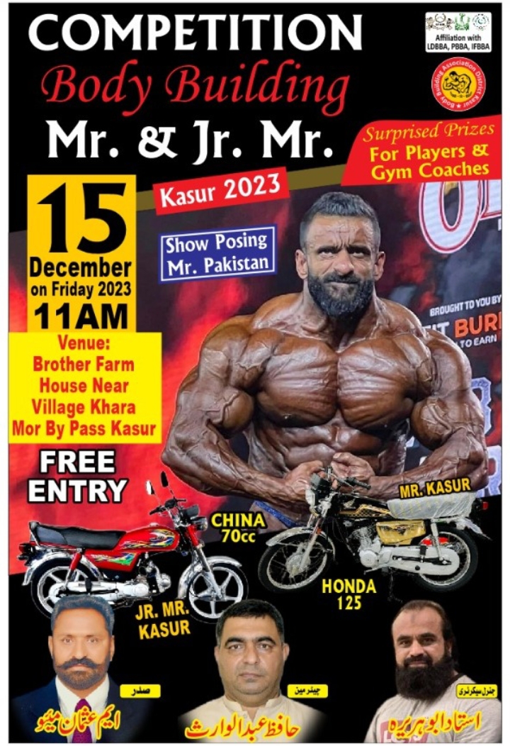 قصور قصور باڈی بلڈنگ کے زیر سایہ سالانہ کمپیٹیشن برادرز لون فارم کھارا بائی پاس میں آج 15 دسمبر کو ہو گا،شو پوزنگ کیلئے مسٹر پاکستان تشریف لائیں گے تفصیلات